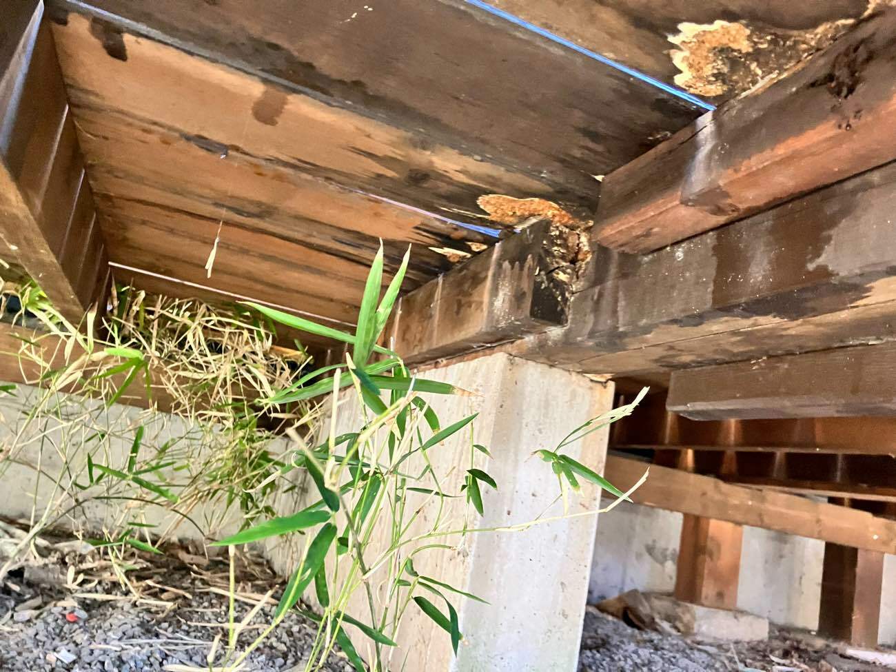 現状のウッドデッキは、腐食により部材が欠け落ちている箇所や腐朽菌の発生が確認できる箇所等、全体的な劣化が見受けられました。