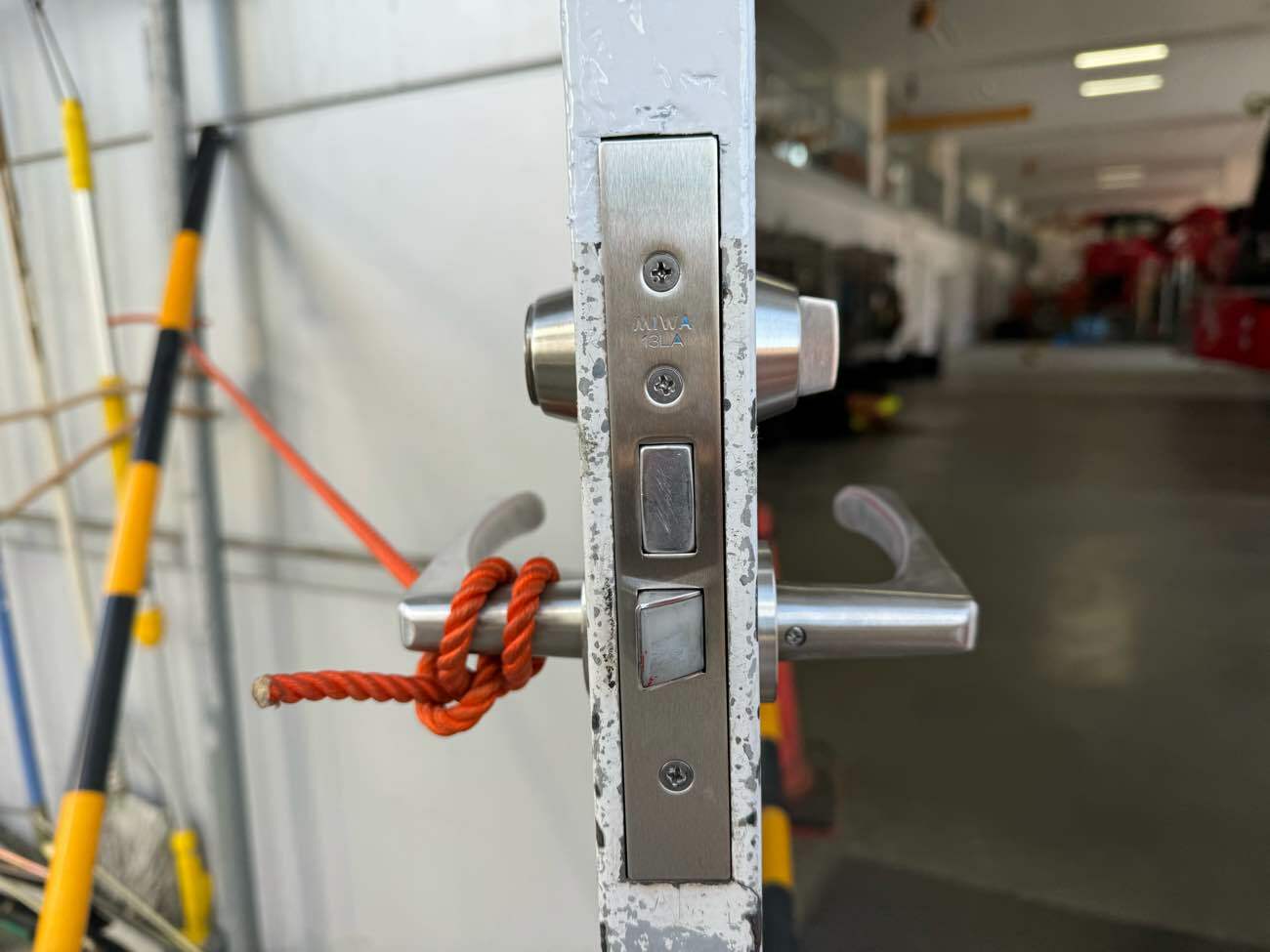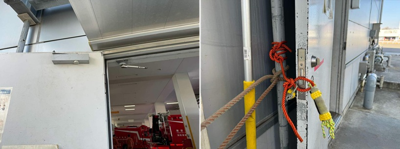施工前(左:ドアクローザーを外している状態 右:扉をロープで固定している状態)