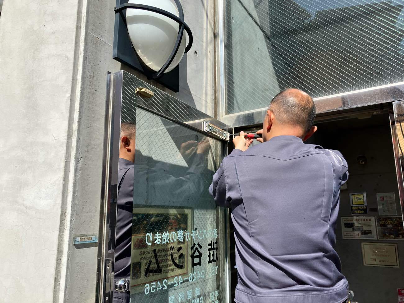 新規ドアクローザー設置作業中