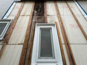 防水シート撤去⇒胴縁補強⇒新規防水シート貼り⇒新規胴縁、見切り材設置⇒新規サイディング壁設置⇒シーリング