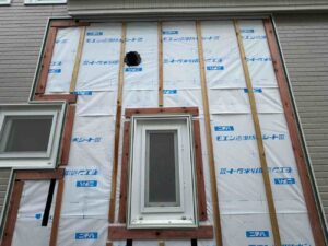 一見、既存壁の下は防水シートとなる為、その上に直接サイディングを張る「直貼り工法」に見えますが、建てた会社の図面によると『外断熱工法』とあり、通常は下記の参考画像のように通気を取るために室内側から「防水(透湿防水)シート」⇒「胴縁」※ここで隙間を設け通気を促す⇒「サイディング」の順番に仕上げます。
