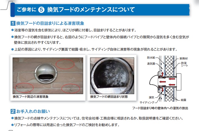 実はこれと似た事例が、日本窯業外装材協会の資料『サイディングの維持管理はどうするの』において、「換気フードの目詰まりによる凍害現象」としても紹介されています。